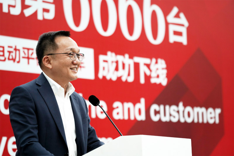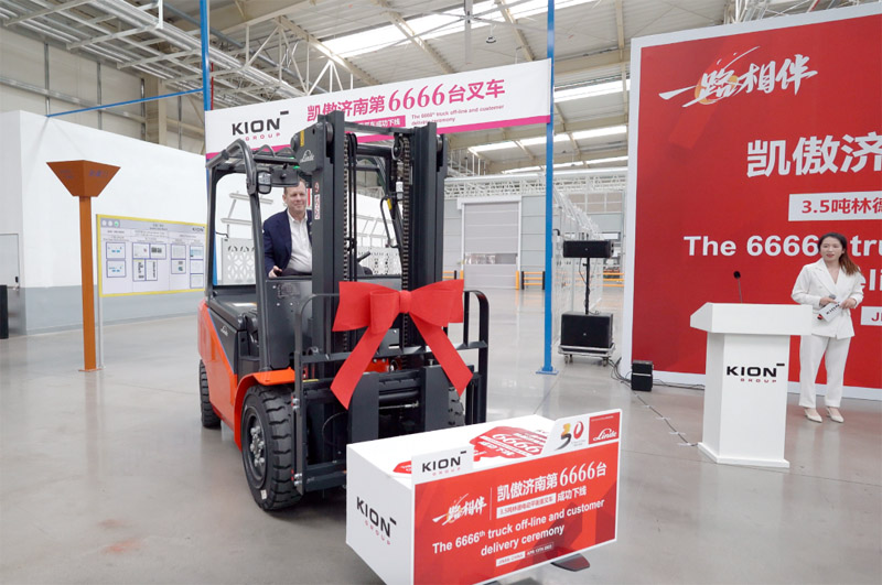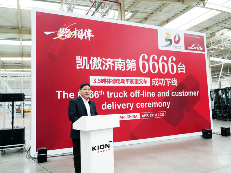 2023年4月13日,一路相伴暨凯傲济南工厂第6666台林德3.5吨电动平衡重叉车下线仪式在济南莱芜智慧工厂盛大举行。凯傲集团首席执行官Rob Smith、凯傲集团董事兼凯傲亚太及美洲区总裁郭进鹏、凯傲集团执行董事会成员以及凯傲中国管理层、海尔集团客户方代表、媒体嘉宾等出席本次活动,共同见证这历史性时刻。